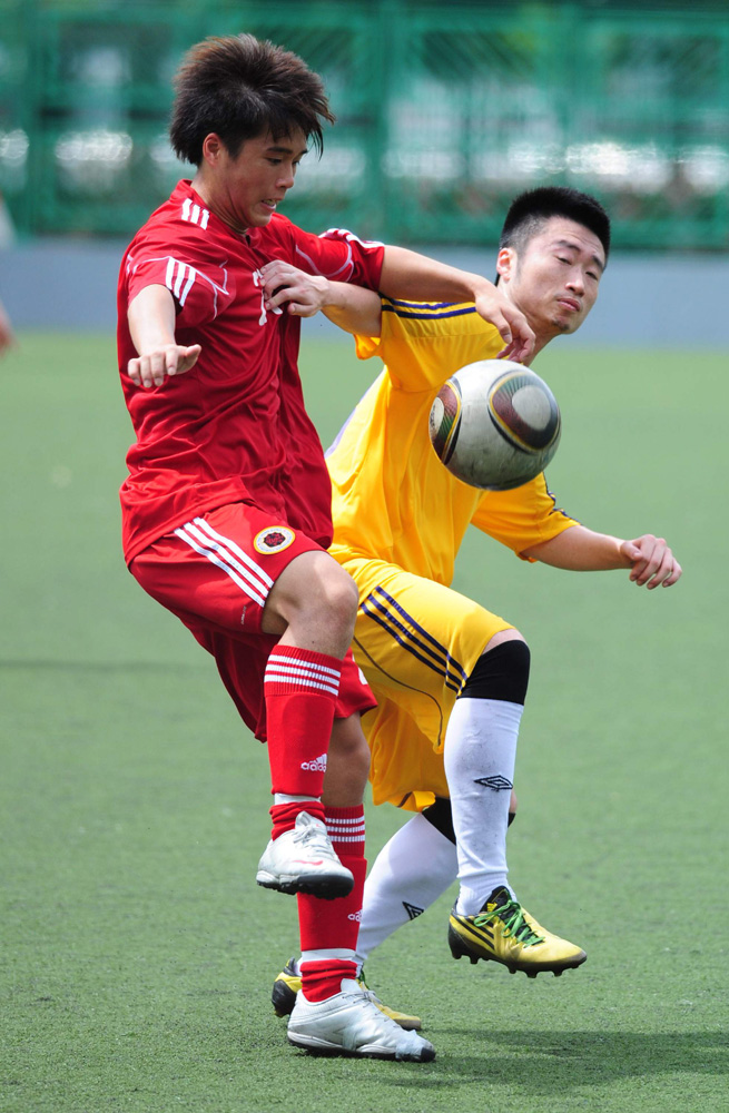 圖:U21港足的甄柏朗(左)與灣仔球員力爭皮球 本報攝