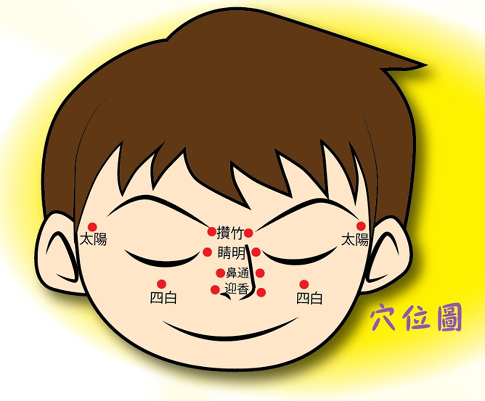 以左右大拇指指腹分別按在左右眉頭下凹陷處,進行打圈按揉,力度輕柔滲透,進行4個8拍。
