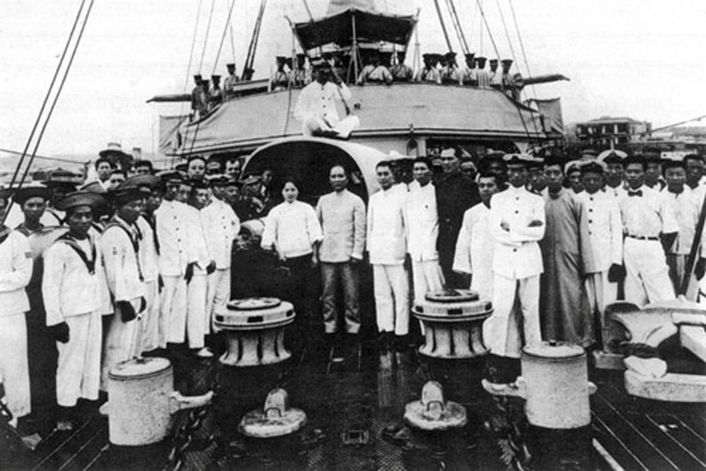 圖:孫中山、宋慶齡與「永豐艦」官兵合影。孫中山逝世後「永豐艦」改名為「中山艦」
