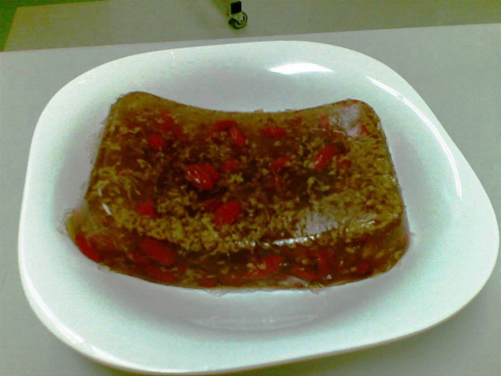 原料︰藥湯+熱水共600ml,冷開水350ml,魚膠粉50g,白糖80g,桂花糖3茶匙,枸杞子15g