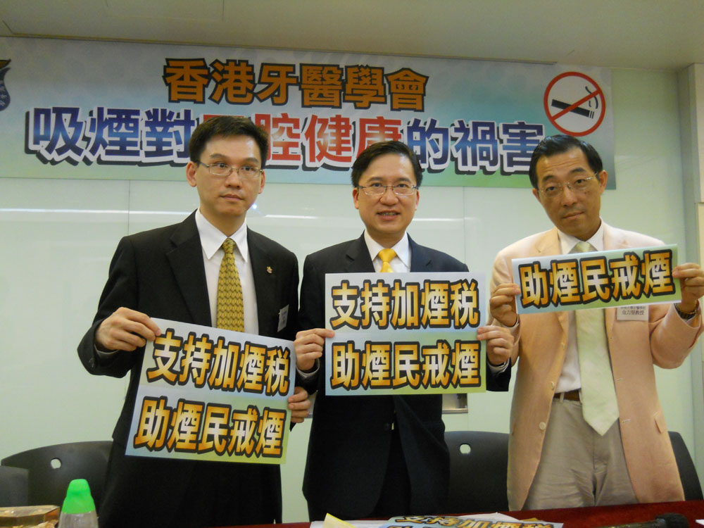 圖:(左起)香港牙醫學會副會長王志偉、會長梁世民醫生、港大牙醫學院牙周病學教授金力堅均對增加煙草稅表示十分支持\本報攝