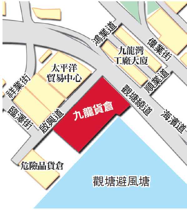 九龍貨倉位於九龍灣啟興道1至5號,佔地約16.58萬方呎,規劃為「商業(2)用途」,早於去年已獲城規會通過其發展計劃,可以興建6幢住宅,合共提供900多個單位;另設1幢零售和餐飲用途的商用建築物。項目今年初更獲屋宇署批出其建築圖則,獲准興建6幢29層的住宅大廈(包括2層地庫),總樓面面積達82.9萬方呎。