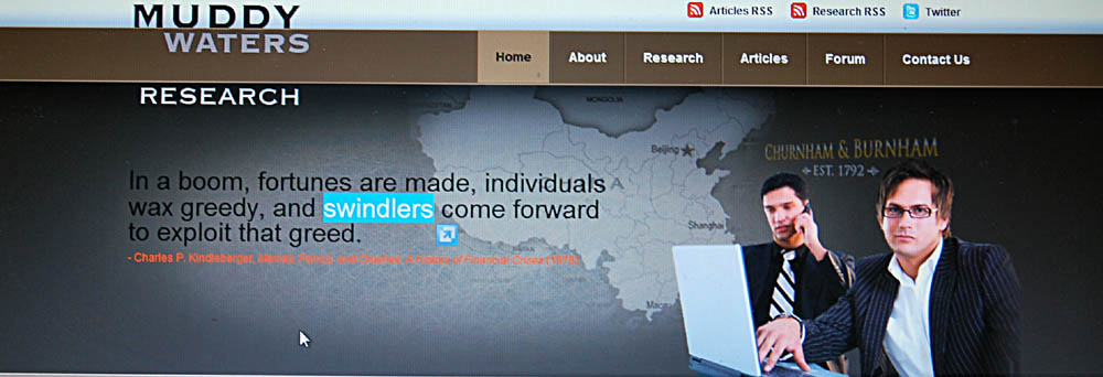 圖:Muddy Waters Research渾水研究公司是諸多做空機構中的佼佼者,該公司官網上稱,其公司名稱源自中國的成語「渾水摸魚」本報攝