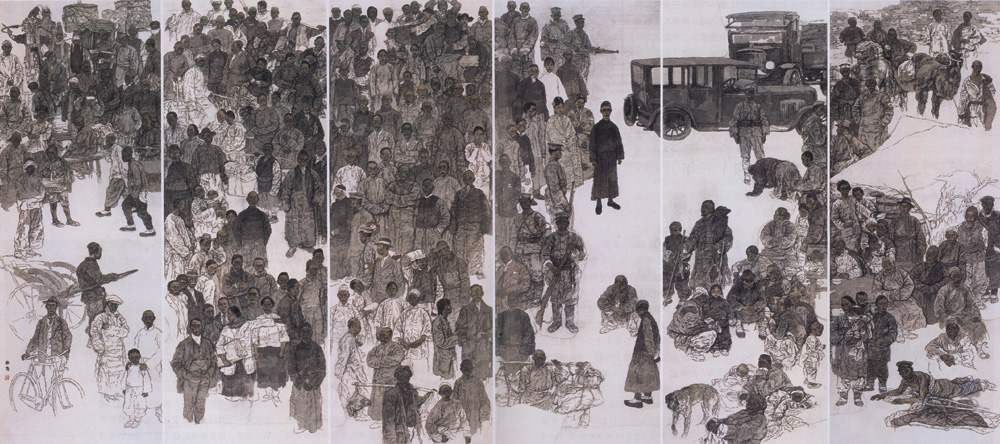 畫家認為繪畫是歷史思考的圖像化,也是表達問題的手段。歷史畫需要畫家對現實和歷史有透徹的了解,也要以崇敬的心態創作歷史畫,並能把環境氣氛和人物形象合理統一。這件作品以六條屏的形式,刻畫了溥儀等從故宮出發的歷史場景。畫中對於人物表情姿態、群體關係、服飾裝束,以及各種背景的參照和空間的設置,都進行了深入細緻的表現。作品再現了當時的歷史時空,五輛汽車組成的溥儀出宮車隊在做出發前的準備,場面浩浩蕩蕩,但氣氛卻低沉壓抑。畫中溥儀、婉容、文綉及其他親屬、隨侍人員,以及荷槍實彈的國民軍士兵,圍觀的人群表情木然,各自在做自己的事情,等待着歷史瞬間的轉變。這個場景應了宣統在幼時登位時說過的話「我不挨這兒,我要回家」的預言,現在溥儀真要回家了!畫家以生活在今天的眼光和跨時空的視角,表達了一種對歷史真實的認識。這是在今天觀照下的真實,也是畫家對自己的情感或意見的視覺評判。面對所描繪的歷史事件和真實人物,畫家用群體肖像來塑造歷史,力求把人物的刻畫、畫家的生活、筆墨的造型巧妙融合,從而形成一個寬廣、宏大的歷史氛圍和真實人物營造的場景,進而給觀眾呈現出畫家所追求的作品的真實性和歷史感。