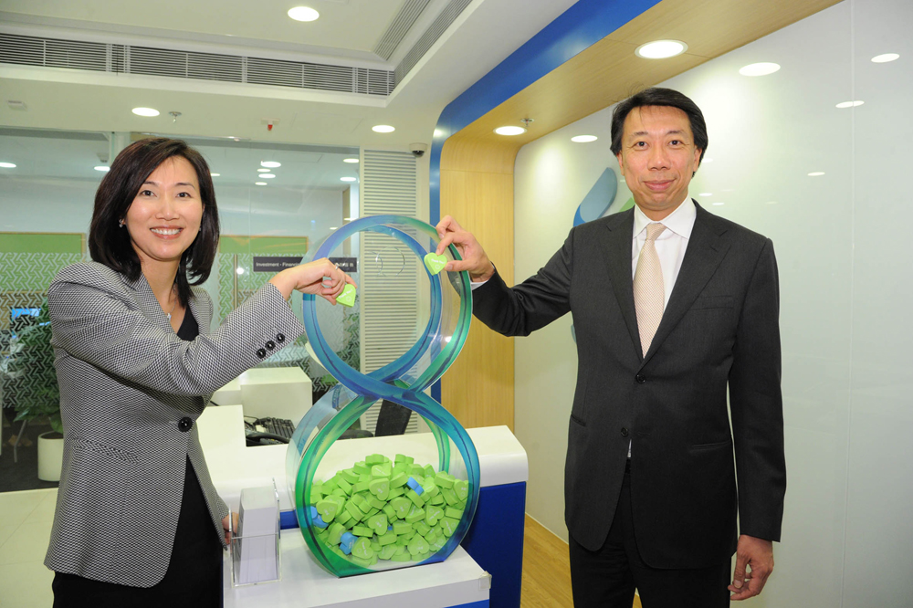 渣打香港個人銀行業務主管禤惠儀(上圖左)表示,若客戶於8分鐘內得到櫃枱服務,將獲給予一個綠心,反之則獲一個藍心,再投放於分行的箱內,渣打會按數目作出捐款。除8分鐘服務承諾外,渣打並在批核貸款方面定下一小時特快放款及一天按揭審批。她續稱,渣打未來會陸續翻新分行網絡,並開發iNeeds程式,前線員工可利用iPad向客戶提供服務。現時渣打前線員工中,約有三成已備有iPad,她希望於今年年底,所有前線員工均備有iPad。禤惠儀旁為渣打香港行政總裁洪丕正。