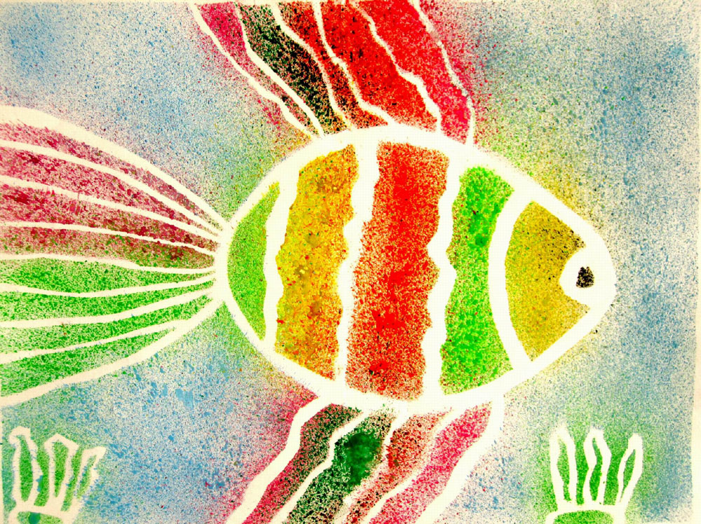 我把色彩噴灑在畫紙上,色彩變得斑斕,魚兒的線條就顯明了。