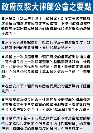 大律師公會曾兩度發表聲明,認為遞補機制剝削市民選舉權,亦違反基本法。政制及內地事務局昨日向立法會提交文件,逐點反駁大律師公會的批評。林瑞麟在昨日上午舉行的立法會(修訂)條例草案委員會最後一次會議上就此作出回應。他強調,基本法或人權法案均沒有規定,一定要用補選來填補出缺的立法會議席,因此,「不一定用補選填補,才符合選舉權」。