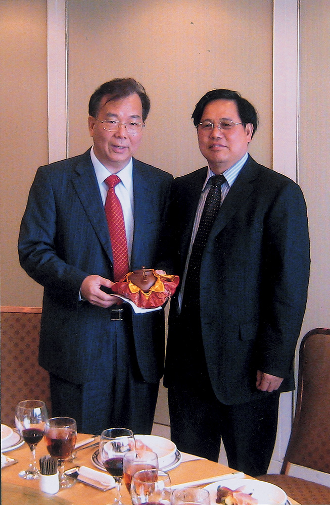 圖:岑可成(右)贈送紀念品給連廣成