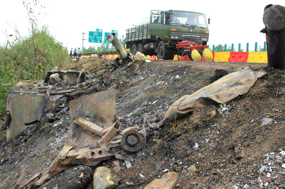 圖:車禍現場到處是燒燬的大客車車身殘骸和配件\李曉波攝
