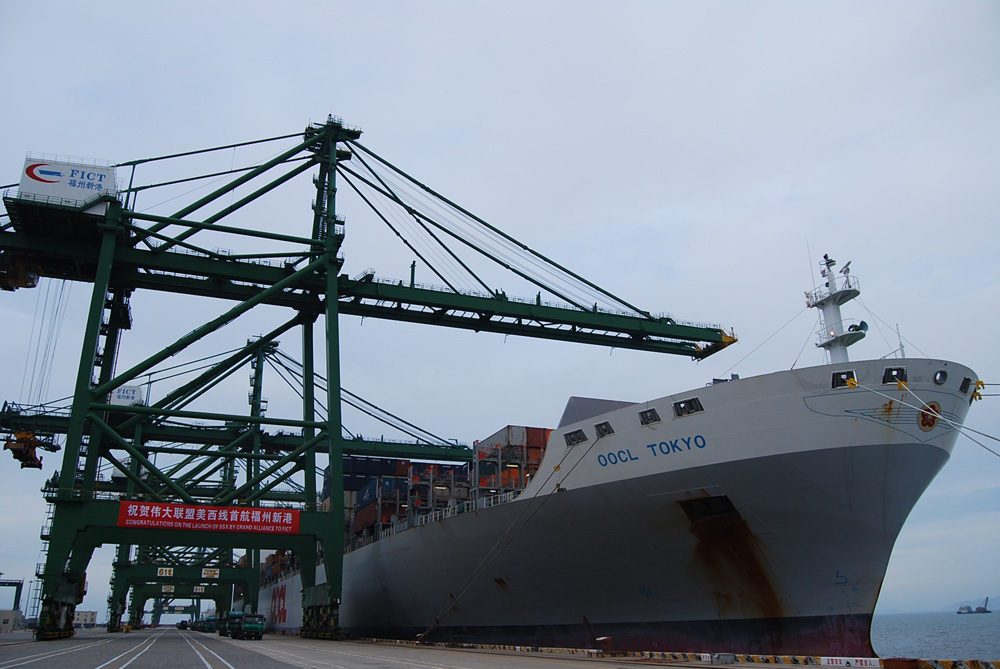 圖:6月21日,偉大聯盟在福州新港開闢美西航線,使該港口擁有兩條美西航線 林田攝