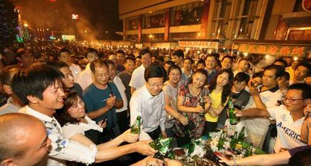 圖:四日晚,張春賢來到烏魯木齊七一星光夜市,和市民共同舉杯\網絡圖片