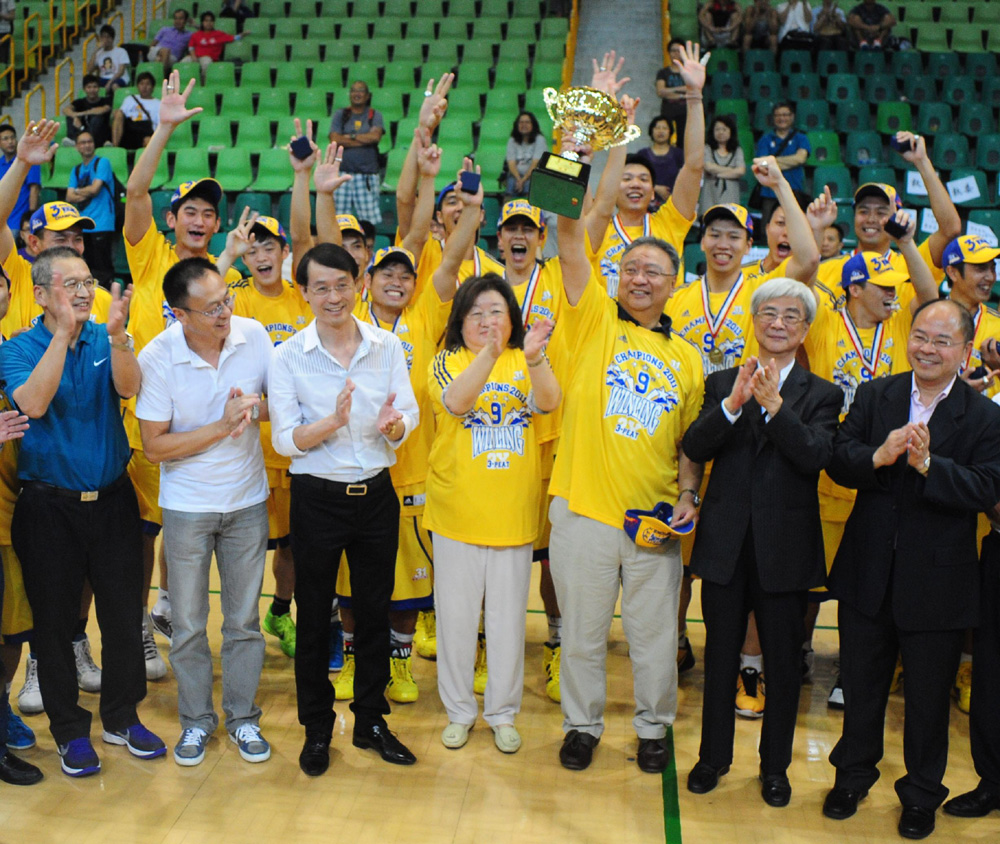 圖:香港籃總會長李群華(前排右二)、常務副會長施維雄(前排左三)、主席陳瑞添(前排左)及康文署高級康樂事務經理譚鴻江(前排右),頒發冠軍獎杯予永倫會長許業榮(前排右三)\本報攝