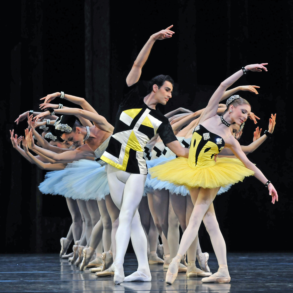 《芭蕾景色》(Scènes de ballet,一九四八年首演)採用史特拉汶斯基(Stravinsky)一九四四年撰寫的同名樂曲作配樂,共分十一個段落─「引子」、「男女群舞」、「首席女芭蕾舞者獨舞變奏」、「首席男和女舞者與群舞女舞蹈員們共舞」、「眾群舞女舞者伴隨首席女芭蕾舞者一起舞動;首席女舞者更分別跟首席男舞者及四位男領舞舞者表演雙人舞」、「集體舞」、「男首席舞者獨舞變奏,四位男領舞舞者相隨」、「首席女舞蹈員第二段獨舞變奏」、「首席男女舞蹈員與三位群舞女舞者同舞」、「群舞,全體登場」及「瑰麗排場,全體演出」。