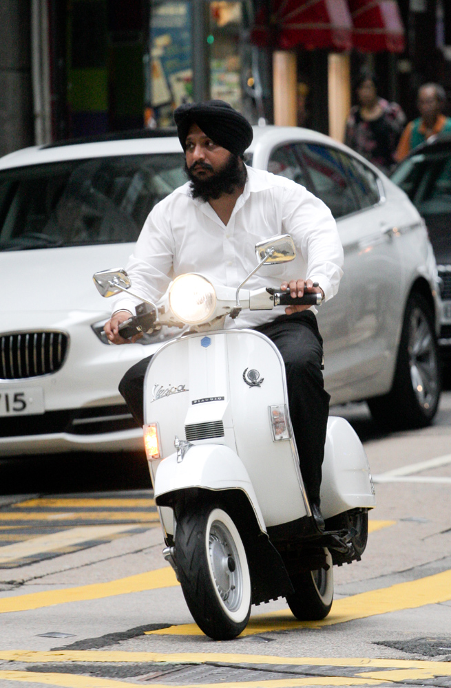香港法律有關道路規例中規定,電單車駕駛人及乘客須戴防護頭盔。為何這位在鬧市中駕駛電單車急速行走的外國男子卻明知故犯,只是戴着一頂黑色的頭巾在馬路中間瀟灑駕車呢?原來,法例也有特殊豁免的情況,由於錫克教的教徒平時必須以頭巾包頭,所以香港政府特別豁免了他們戴頭盔的必要。這是出於宗教的需要,但不代表其他人以頭巾包頭就可以豁免戴頭盔。