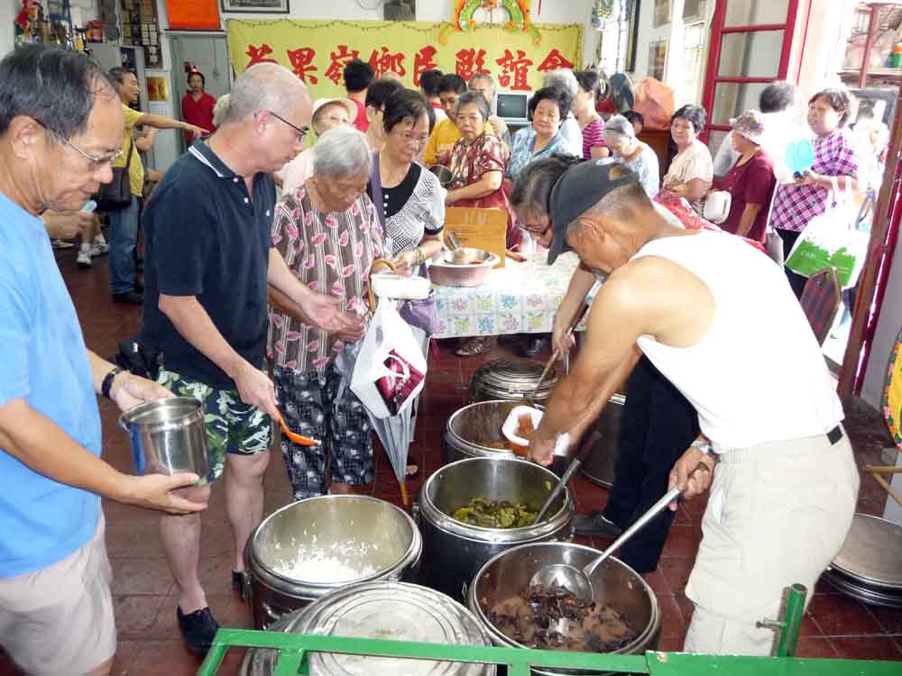 拜祭完後已是中午,村民返回鄉公所,準備派發「師傅飯」。食物採用客家煮法,有三菜一飯,主菜是炆豬肉,配菜有鹹菜和雲耳。大約有百多名村民自備盛具到來,以長者和年輕人佔多,半小時多便已派完。