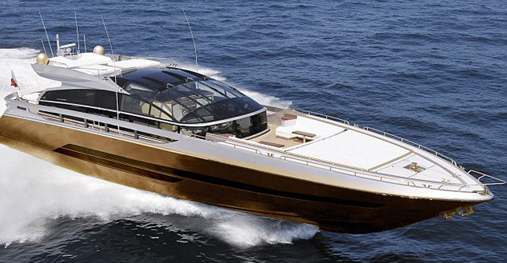 這艘遊艇從「十足真金」的船底,到甲板、餐廳、船舷到船錨,一路金鉑到底。遊艇上的主臥室同樣奢華:除了整間鉑金裝潢,還有又貴又詭異的史前裝飾牆──建材是隕石和一根如假包換的暴龍骨頭。