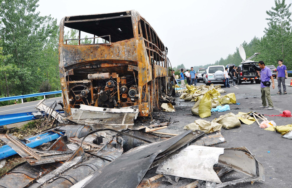 圖:客車燒毀嚴重 中新社