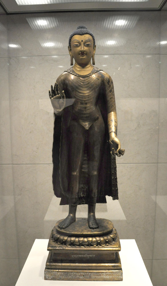 圖:佛立像 七世紀前半 銅鎏金,局部泥金彩繪,鑲嵌銀、紅銅 高94厘米 拉薩布達拉宮管理處藏