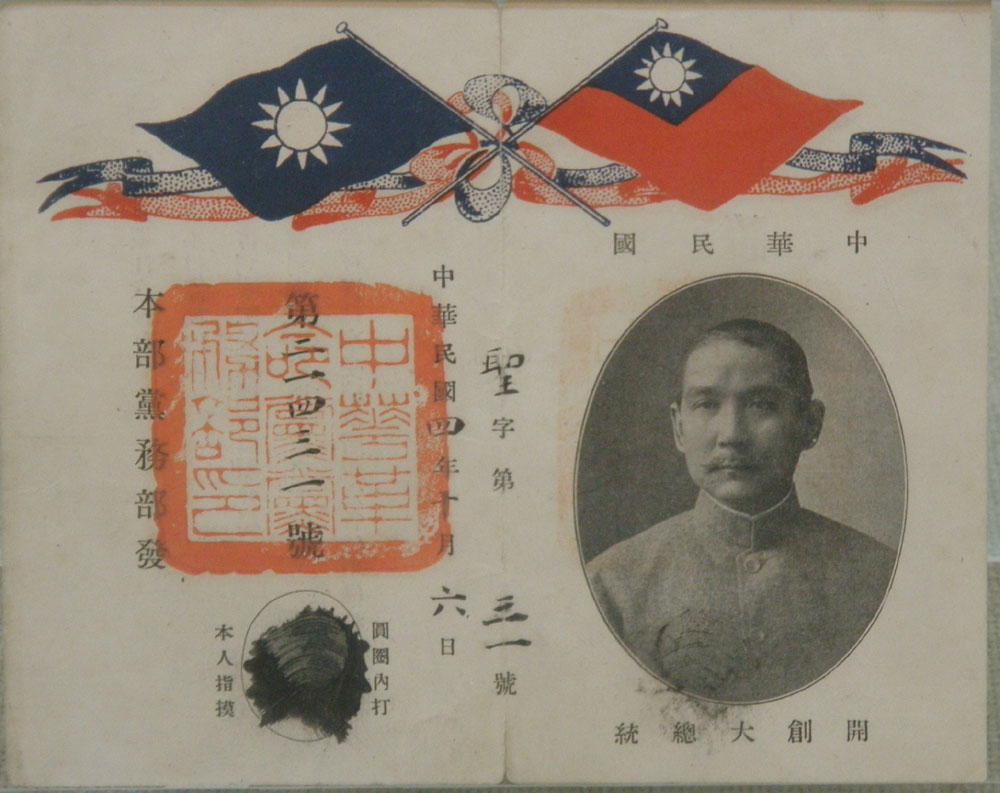 本次展覽中,一組四個黨員證:一九一一年中國同盟會廣東支部的入會證書(館藏三級文物)、一九一三年國民黨黨員證(館藏三級文物)、一九一五年中華革命黨黨員證以及二五年中國國民黨的黨員證,反映了中國國民黨的組織變遷。