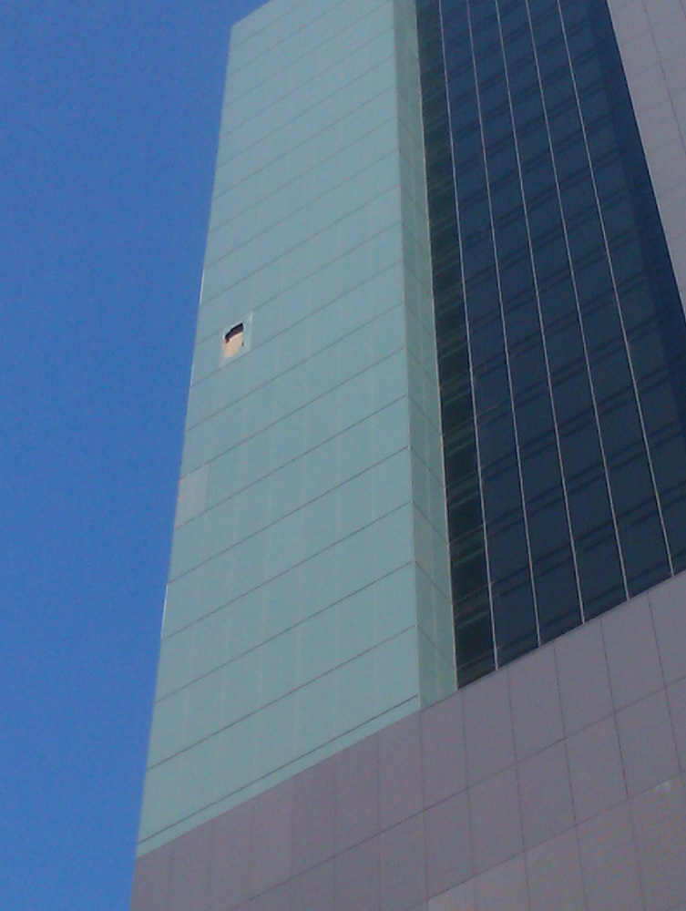 圖:碎裂的一塊玻璃幕牆位於二十樓,約三米高、一米半闊