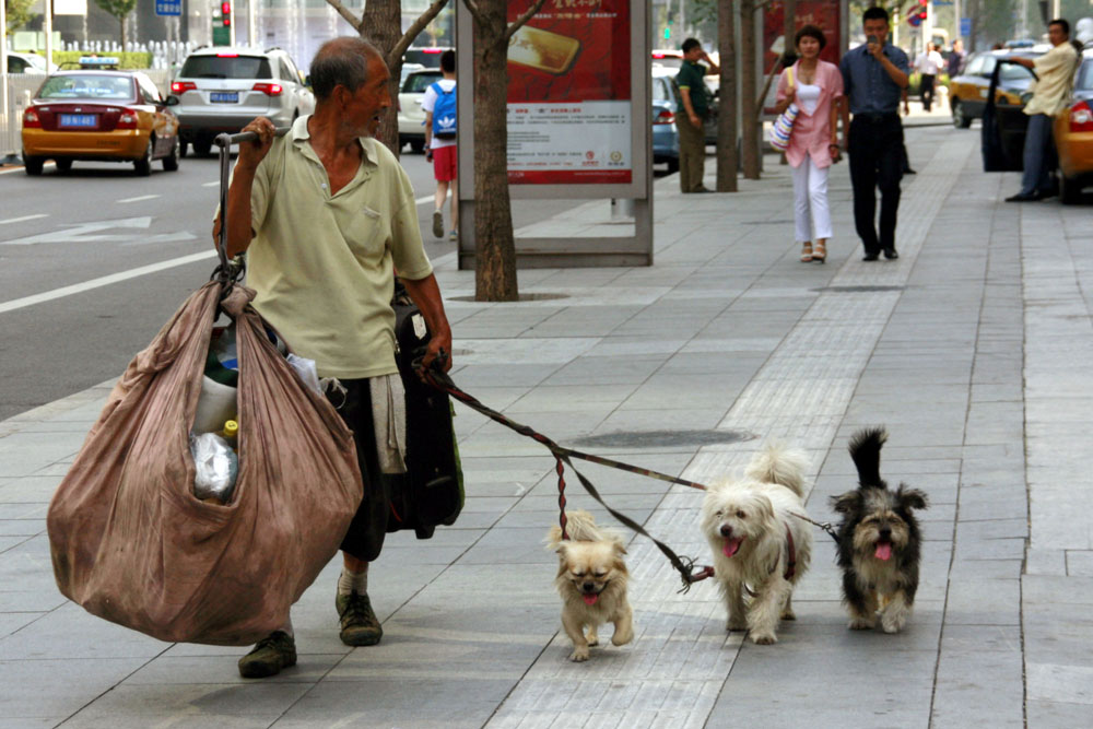3日,一名拾荒者帶着三頭寵物狗在北京金融街且遛狗且撿垃圾。他說,這些狗都是撿來的流浪狗,餵牠們吃狗糧,自己則省吃儉用。