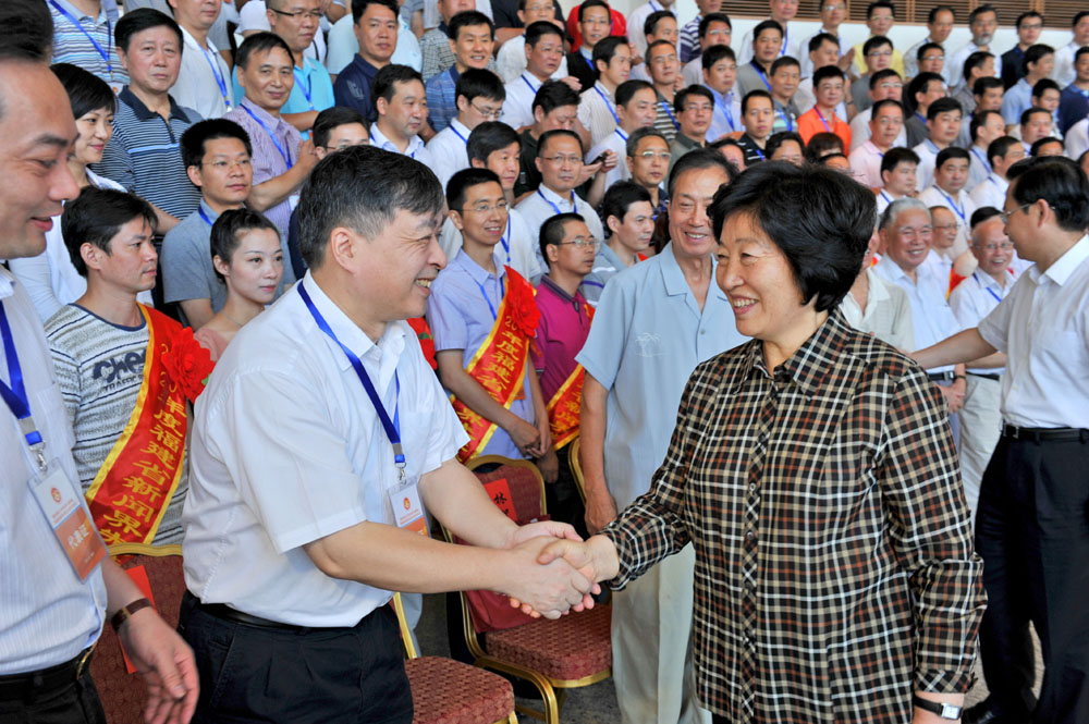 圖:福建省委書記孫春蘭、省長蘇樹林和省委常委陳文清、唐國忠、楊岳、陳樺等及中國記協黨組副書記高善罡與會議代表合影。圖為孫春蘭與與會代表親切握手楊勇攝