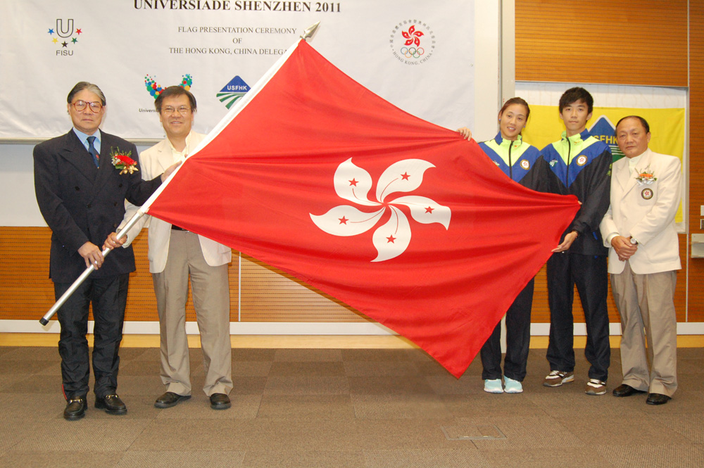 【本報訊】第二十六屆世界大學生運動會將於明天在深圳掀開帷幕,香港代表團會派出由102人組成的歷來最龐大陣容,分別競逐15個項目的殊榮。港協暨奧委會會長霍震霆昨授旗予港代表團團長陳炳祥及男子跆拳道好手周永雄和女子沙灘排球成員謝穎紅,藉此祝願一眾健兒能為香港爭取佳績。