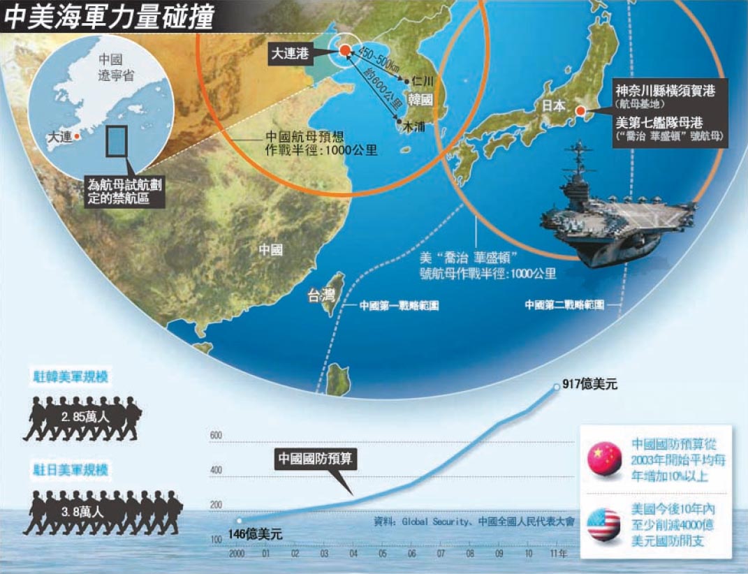 去年3月發生「天安艦」爆炸沉沒事件後,韓美兩國欲在韓國西海(中國稱「黃海」)實施美國航母參與的聯合軍事演習,結果遭到中國的強烈抗議。中國選擇和韓國西海相連的大連作為航母基地。該報認為,這意味着作戰半徑達1000公里的中國航母可以徜徉於朝鮮半島附近海域。這樣一來,西海就成為中國海軍的近海。