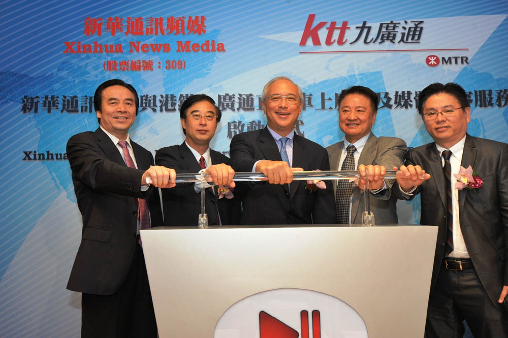 圖:左起:新華通訊頻媒執行董事毛洪成、新華通訊頻媒主席俱孟軍、港鐵公司主席錢果豐、新華通訊頻媒聯席主席勞國康、新華通訊頻媒行政總裁張明主持啟動儀式