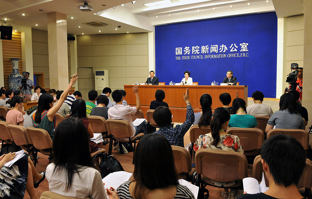 圖:8月9日,國務院新聞辦公室在北京召開新聞發布會,主動向公眾介紹中國婦女兒童發展綱要(2011-2020年)頒布實施情況並回答記者提問\新華社