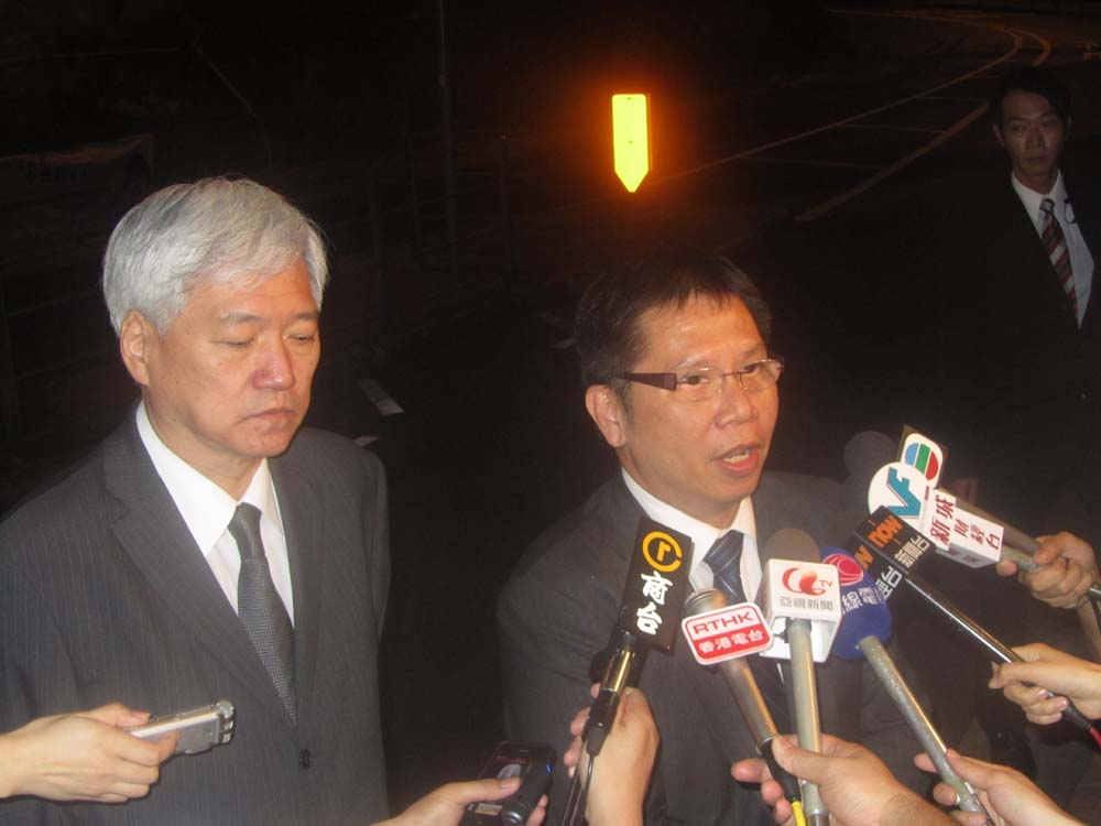 圖:董耀中(左)表示,參加兩天團的團友可向旅議會申請賠償,或依照信成假期安排如常出發。圖右為旅議會主席胡兆英\本報攝