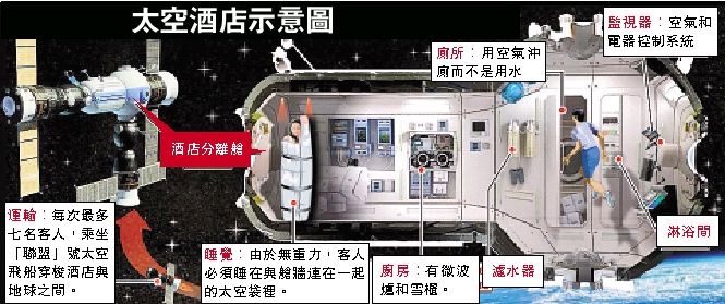 僅僅登上這個酒店就是一項冒險了——旅客需要乘坐「聯盟」號太空飛船兩日。而這一旅行花費亦不菲:5天的太空停留就將花費10萬英鎊(約合港幣128萬元),而全部的花費加起來可能達到50萬英鎊。