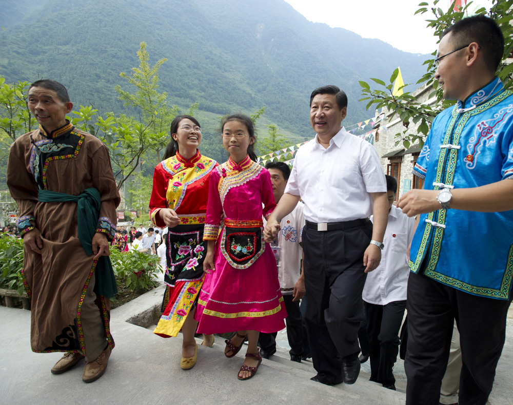 三年前,習近平曾專程到四川地震災區慰問受災群眾,看望救災人員。這次他一下飛機,首先驅車前往當時受災最嚴重的北川縣。沿途看到一座座嶄新的城鎮和村落,看到災區發生了脫胎換骨的巨變,習近平十分欣慰。在北川縣擂鼓鎮吉娜羌寨這個震後新建的羌族村寨,習近平同村民和旅遊觀光者親切交談,同鄉親們圍坐在一起拉家常,仔細了解群眾生產生活情況,關切詢問還有什麼困難,勉勵大家堅持艱苦奮鬥,依靠自己雙手把家園建設得更加美麗、更加富饒。在北川縣新縣城,習近平深入禹龍社區和居民家中了解災後重建、社區建設和居民安置情況。在東方汽輪機有限公司,習近平對工人們表現出的堅韌不拔、克難攻堅的大無畏精神給予高度評價。習近平指出,災區發生的巨變,充分證明中華民族是任何困難都難不倒的偉大民族,充分證明社會主義制度能夠集中力量辦大事的優越性。