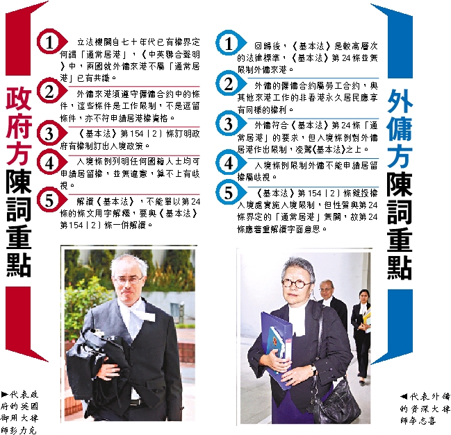 雙方律師連日圍繞入境條例中限制外傭並非「通常居港」是否違憲展開激辯。代表政府的英國御用大律師彭力克早前提出多項有力理據,包括本港立法機關一直享有界定何謂「通常居港」的權利,解讀《基本法》不能只看第二十四條而要聯繫第一百五十四條一起理解,以及若入境條例對外傭在港逗留屬違憲的法律後果等同削弱立法機構獨立角色等,力證入境條例對外傭來港作出限制、將外傭排除於「通常居港」外並無違憲。