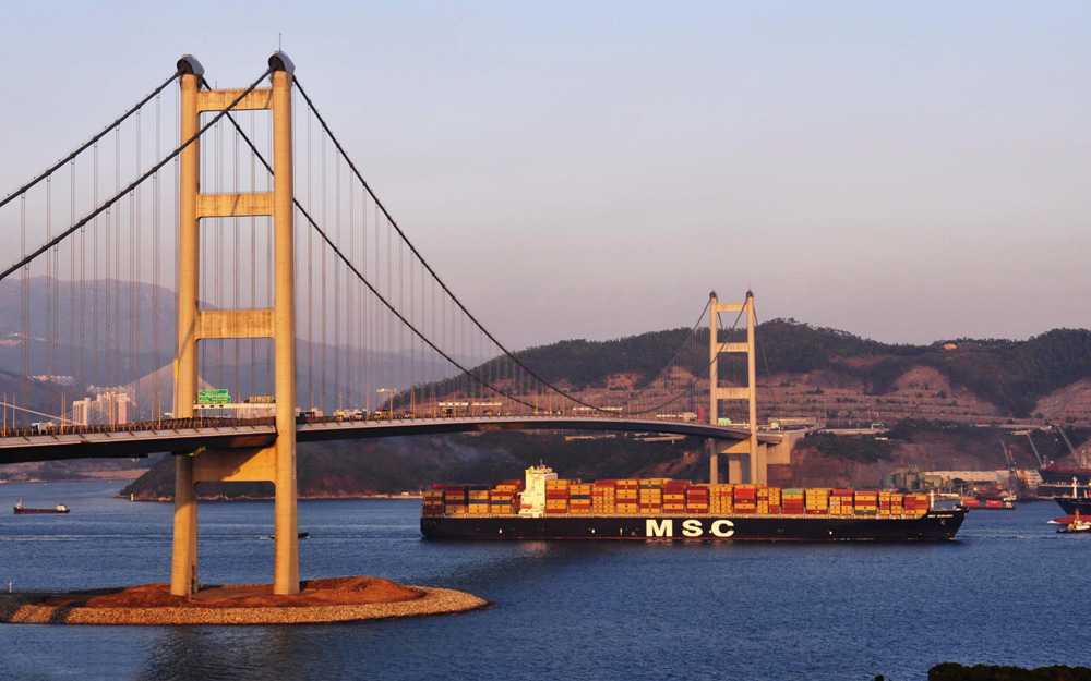 圖:得力於香港海事處協助,招商局深西港口上半年開始掛靠1.4萬箱船,解決了經過青馬大橋的技術問題,圖為地中海航運大型貨櫃船通過青馬大橋 資料圖片