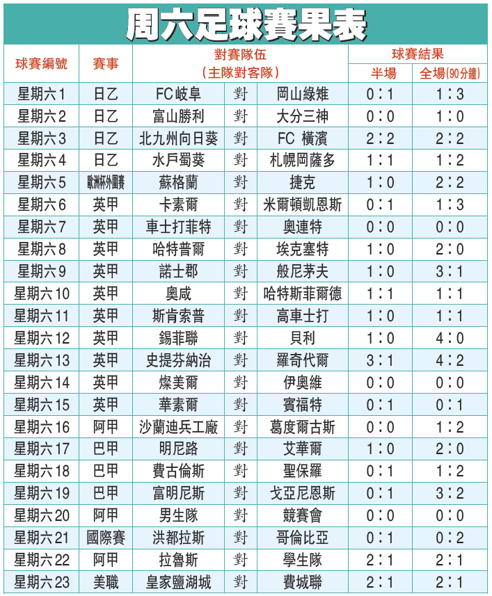 周六足球賽果表