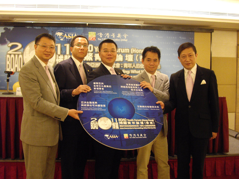 圖:香港菁英會主辦2011博鰲青年論壇(香港)。左起:菁英會前主席白富鴻、創會主席施榮忻、主席洪為民、論壇籌委會主席廖偉麟及菁英會常務副主席楊華勇