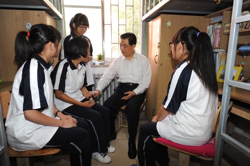 圖:9日,胡錦濤來到北京市第八十中學,親切看望師生員工。這是胡錦濤在學生宿舍了解在該校就讀的西藏學生的學習和生活情況\新華社