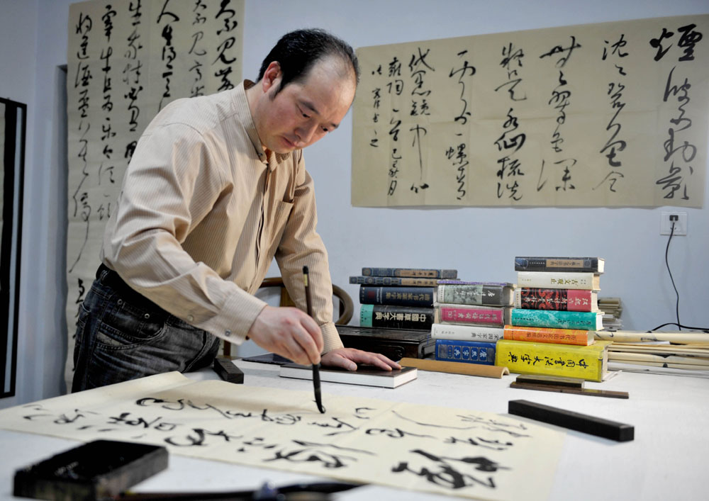 書法的愛好者很多,專職寫書法卻很少。河南省許昌學院副教授張宏偉把熱愛變成工作實在難能可貴。張宏偉說,書法是一種生活狀態,是一種思維方式,書法藝術蘊含着傳統的文化和思想,書之妙道,神采為上,言為心聲,書為心畫。