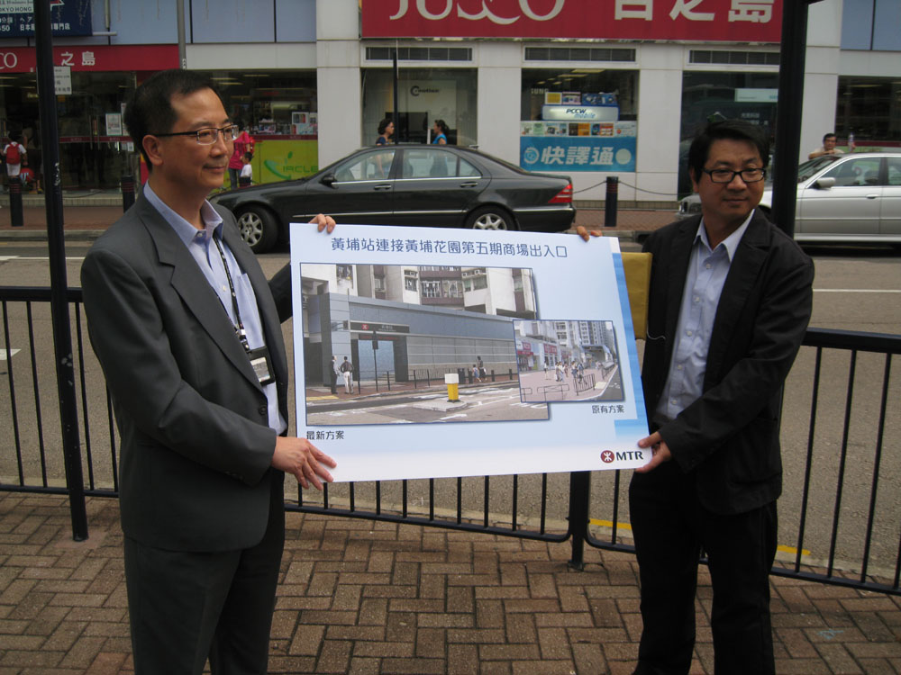 圖:鍾國良(左)表示,黃埔站將有兩個出入口連接黃埔花園商場,包括位於德安街的車站\本報攝