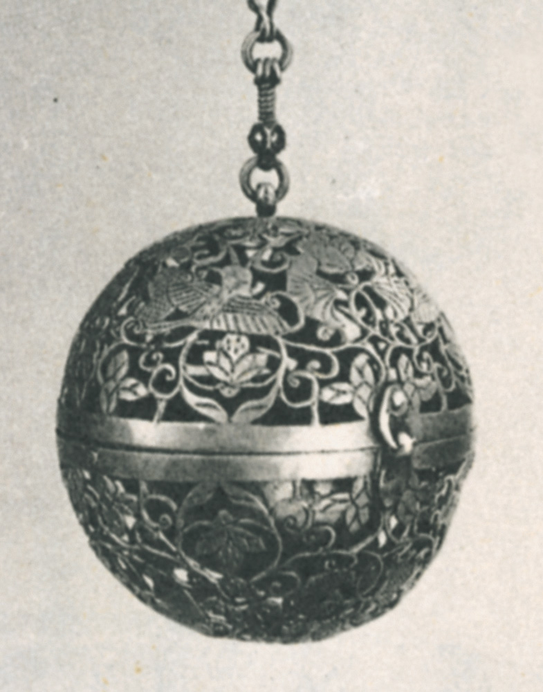 《古樂府·孔雀東南飛》謂:「紅羅復斗帳,四角垂香囊。」《晉書·謝玄傳》指「玄少好配紫蘿香囊」,可見一斑。不過,香囊、香包乃用色布或彩綢縫製,較民間化。唐代武則天至唐玄宗期間,則流行獨特精美的金銀鏤空香薰球;不但可垂諸床帳四角和繫佩腰間,更可以作為被中小「香薰爐」、或如袖珍香球,繫於古人寬闊衣袖之中。