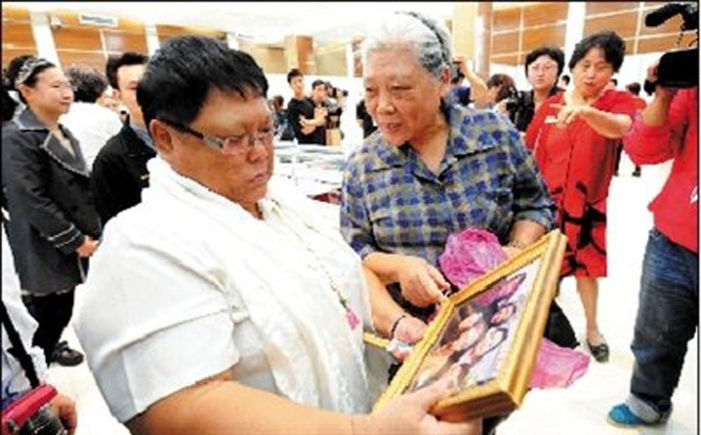 圖:畫展上,鄧林(左)的師姐、畫家吳麗珠女士將她們與李苦禪夫人合影的老照片送給鄧林網絡圖片