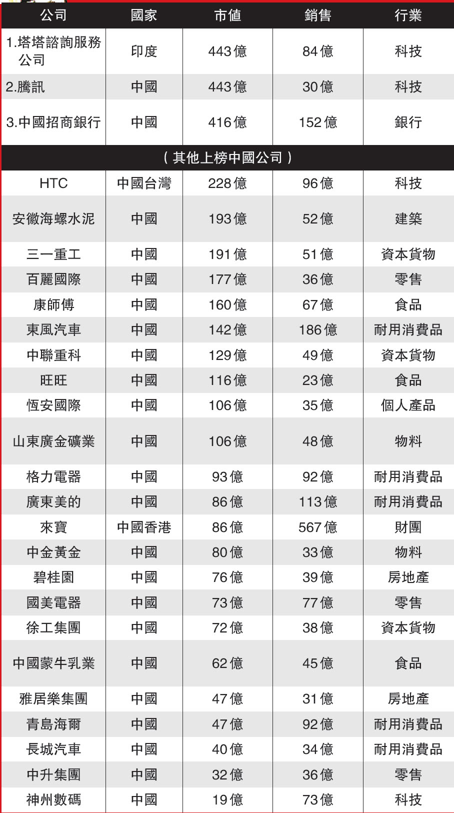 按行業看,技術公司再次主導該榜,達到8家,去年則為11家。消費耐用品業佔第二位,有7家。第三位是食品公司,佔6家。該榜連續第二年沒有石油公司入圍。