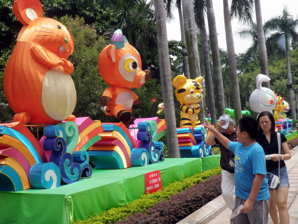 在公園中軸線等重要的景觀通道上,擺放的「赤兔呈祥」、「舞動豐年」等大型燈組,也相當程度地採用LED燈作為主體材料,通過已編好的程序播放出流光溢彩的效果。而且將先進的材料和科技融入到反映廣州地域特色的設計理念中,此次燈會在保持傳統特色的基礎上,體現了時代特色,凸顯出地道的廣州味。