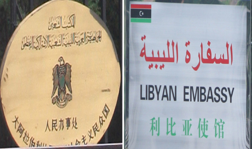 圖:利比亞駐華使館門口13日換上了新的門牌,上面寫着「利比亞駐華使館」(右),而之前的門牌寫的是「大阿拉伯利比亞人民社會主義民眾國人民辦事處」(左) 新華社