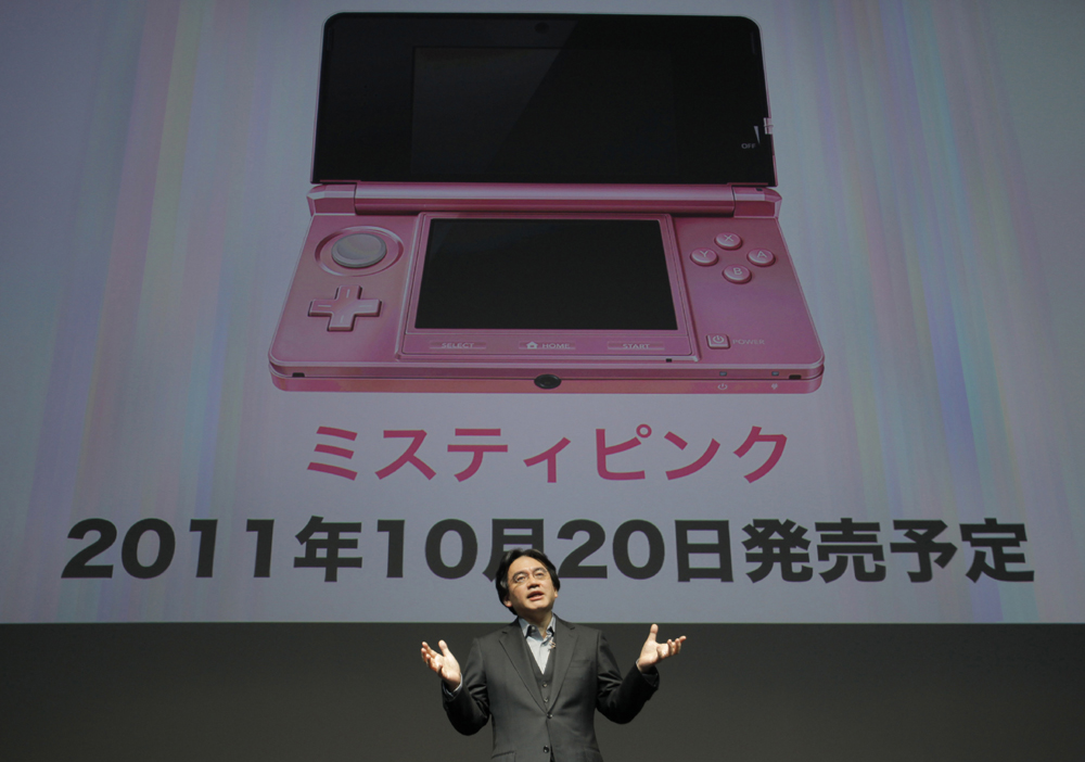 圖:任天堂社長岩田聰展示即將推出的粉色3DS主機 美聯社