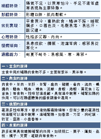 陽虛體質的人,多體形白胖,肌肉鬆軟,手足不溫,喜食溫熱,精神晦暗,口唇色淡,毛髮易落,易出汗,大便溏薄,小便清長。性格多沉靜、內向。長期偏嗜寒涼食物也會形成這種體質。易患水腫、腹瀉等,多為寒症,且易感濕邪。可多吃容易「發」(甘溫益氣)的食物,注意保暖,尤其是足下、背部及下腹部丹田部位的防寒保暖。