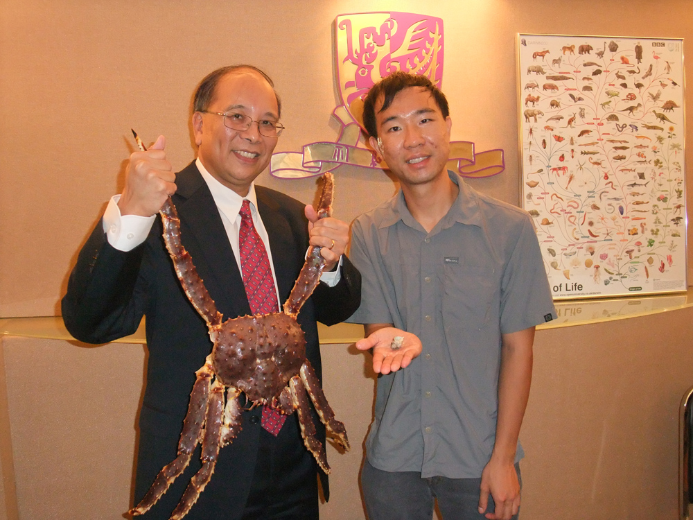 圖:朱嘉濠教授(左)及曾令銘博士展示皇帝蟹與寄居蟹在體積上的巨大差別