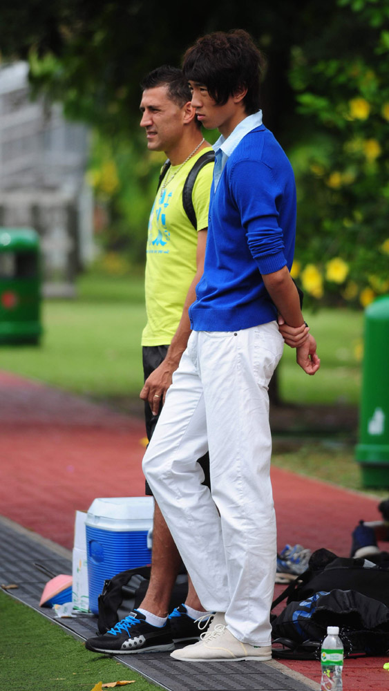 圖:侯宇(前)與因傷免操的高尼路在場邊觀操本報攝
