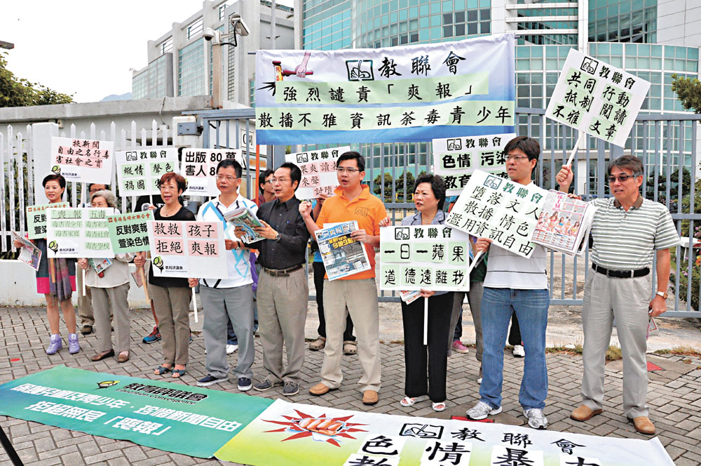 教聯、教評會代表一字排開,宣讀抗議聲明,抨擊《爽報》及其電子版充斥色情成分,包括圖片、標題、文字、小說、動畫、聲音等,不宜青少年和兒童閱讀。他們指出,《爽報》聲稱每日刊行八十萬份,直接派予青少年學生等市民,帶來極壞影響,實際是毒害八十萬人。兩會譴責《爽報》濫用出版自由,散播色情資訊,荼毒社會,嚴正要求該報立即刪除有關內容。